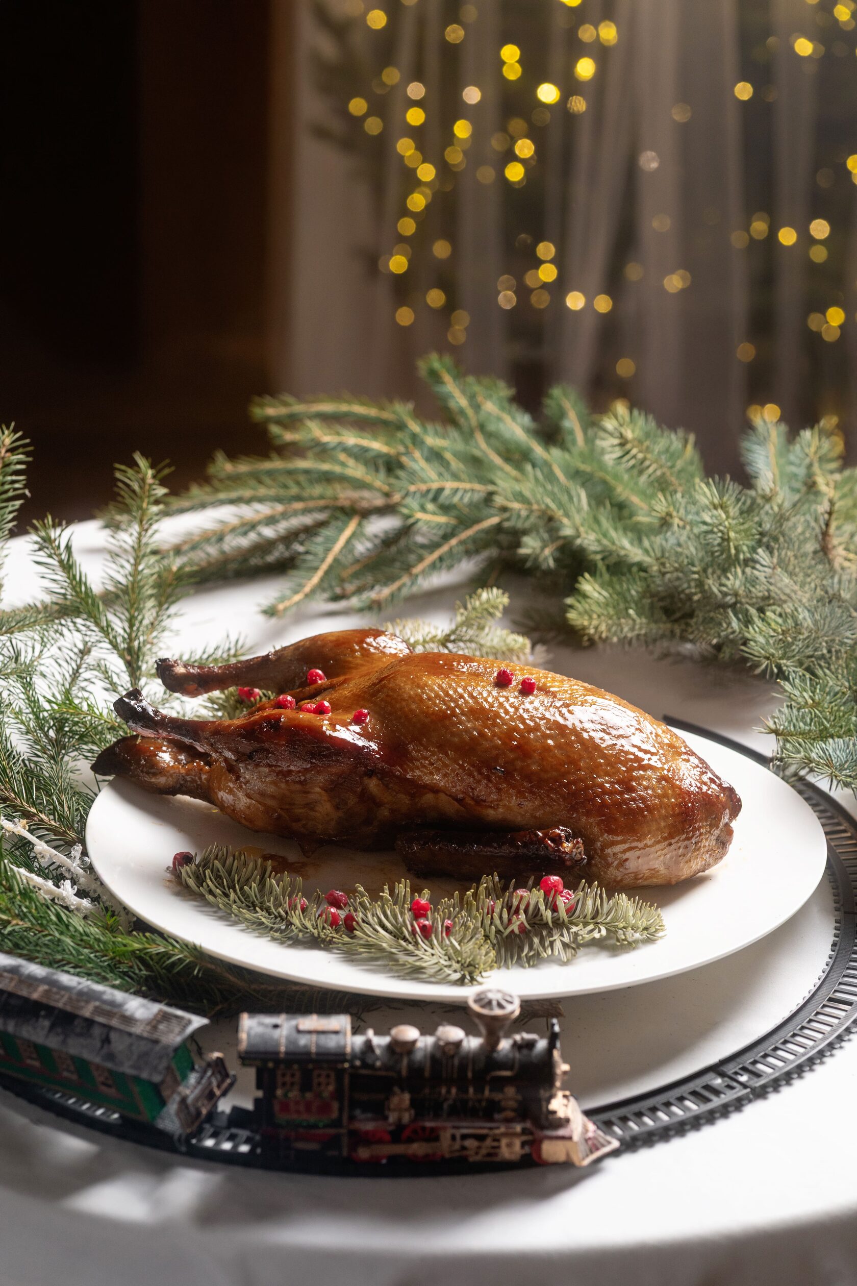 Утка фаршированная тушеной капустой, с клюквой и грибами
